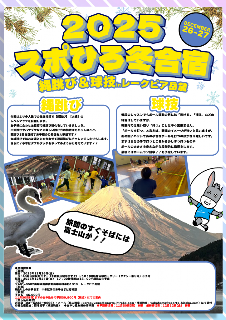 【2025スポーツひろば冬合宿のご案内】こんにちは!最近はポケモンZAにどっぷりハマっております笑 11月に入り、寒い日も…